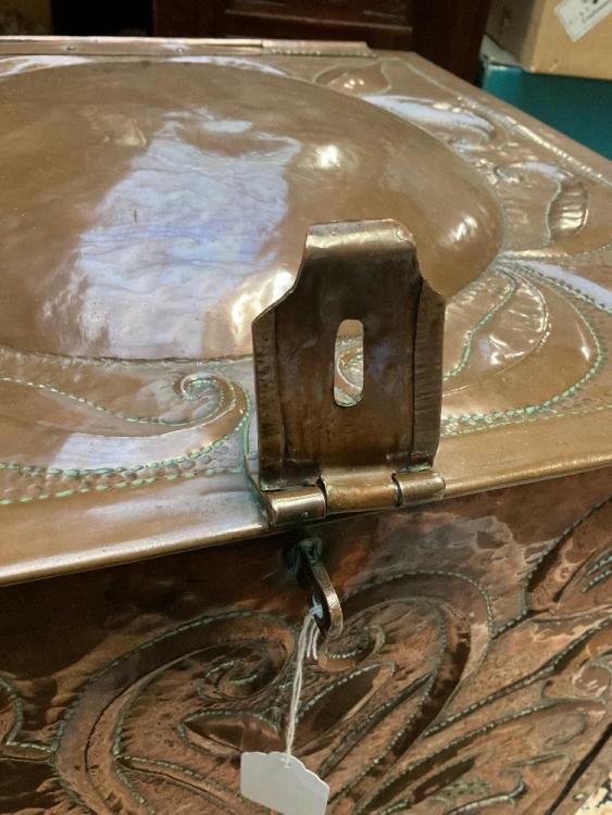 Lot 1589 of 2131: JOHN PEARSON (1859-1930); a good Arts & Crafts embossed copper log bin, the hinged lid with domed central panel and simple catch, both front and sides decorated with twin birds beside stylised floral scrolls and raised on four scrolling supports, the base signed 'J. P 1900', height 52cm, width 43cm, depth 44cm.