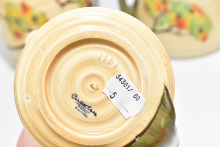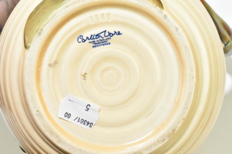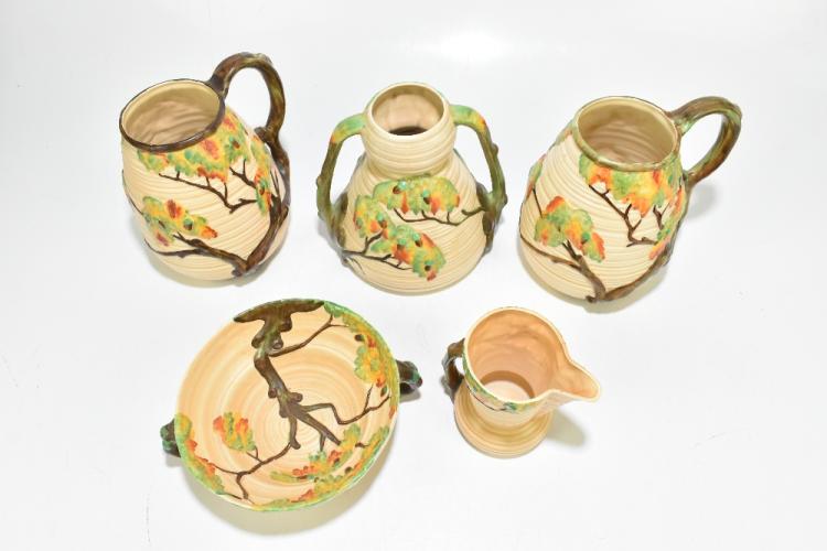 Lot 1608 of 2131: CARLTON WARE; five pieces of 'Day' oak and acorn decorated wares comprising two handled vase, height 21.5cm, a pair of jugs, twin handled bowl and a further jug (5).