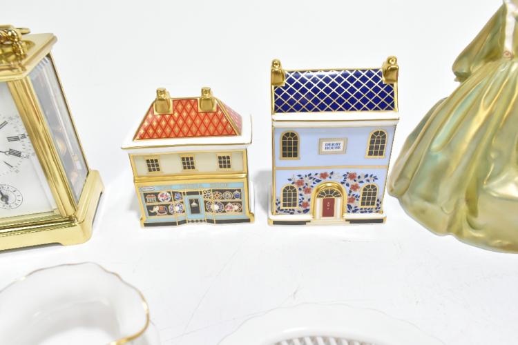 Lot 1638 of 2131: ROYAL DOULTON; four figures, HN2038 'Peggy', HN2211 'Fair Maiden', HN1955 'Lavinia', and HN1467 'Monica', also a Royal Worcester figure 3081 'Grandmother's Dress', two Royal Crown Derby paperweights modelled as houses, a small group of decorative ceramics and a modern brass carriage clock.