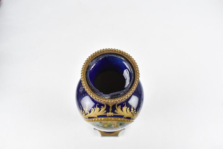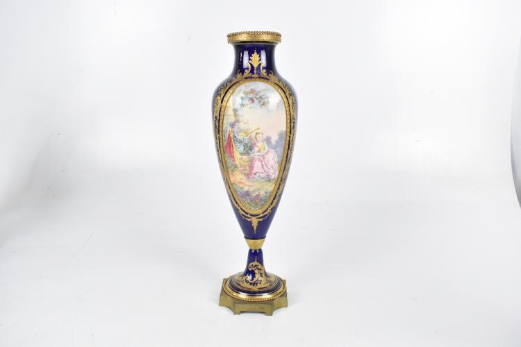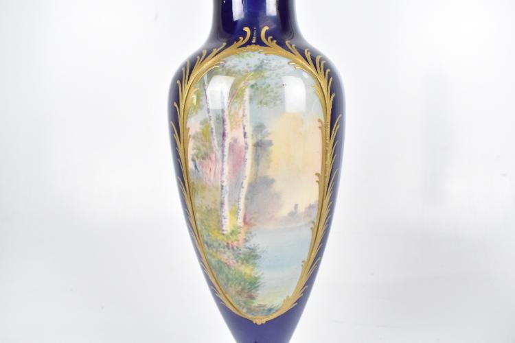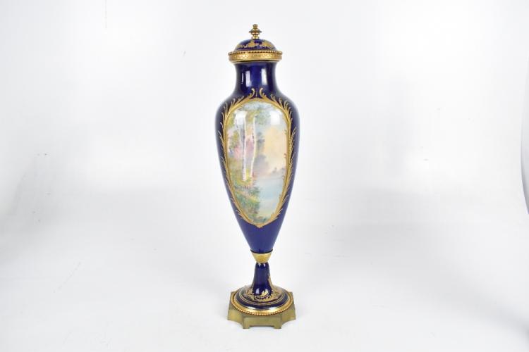 Lot 1641 of 2131: A pair of Sevres porcelain vases well painted with oval vignettes of a courting couple opposing landscape within a gilt heightened border raised on a gilt metal foot and each with cover, the covers bearing Sevres mark and also JPT, height 42cm, af.