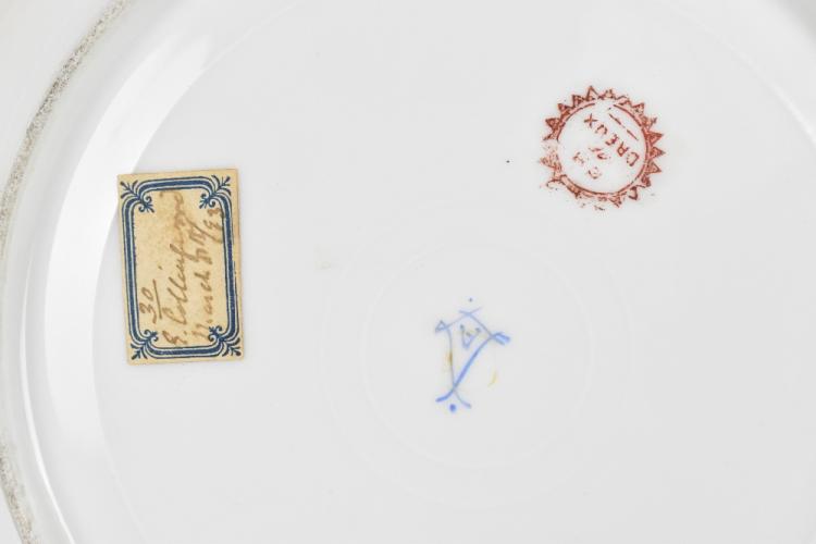 Lot 1648 of 2131: SEVRES; a cabinet plate with gilt decorated border on a dark blue ground and with central panel, signed Quentin, decorated with a couple seated in an interior drinking and one smoking a clay pipe, painted and printed marks to the reverse and also bearing an old collection label verso, diameter 23.5cm.