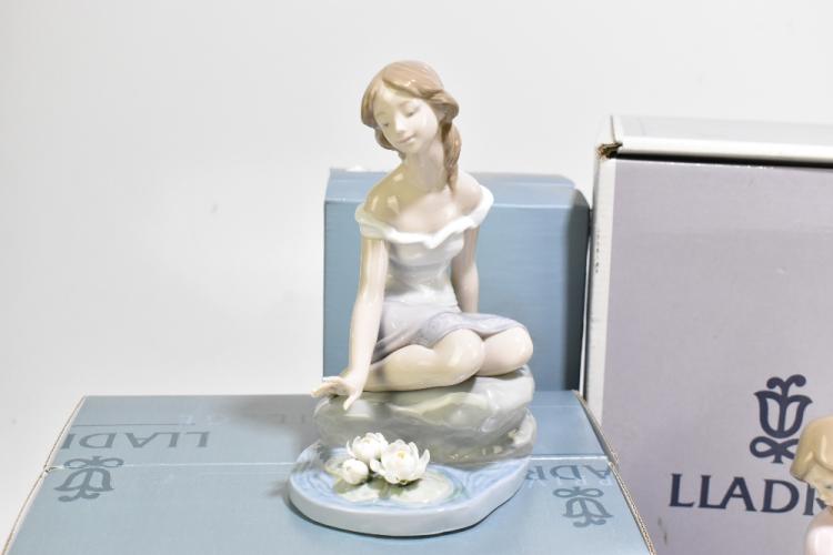 Lot 1663 of 2131: LLADRO; four figures comprising girl with a basket of flowers, mould number 7622, height 24cm, girl with a parasol, number 7636, the 2007 annual figure piece of girl with tulips, number 7712, and a Lladro Privilege Society 2005 figure of a seated maiden, all with original box (4).
