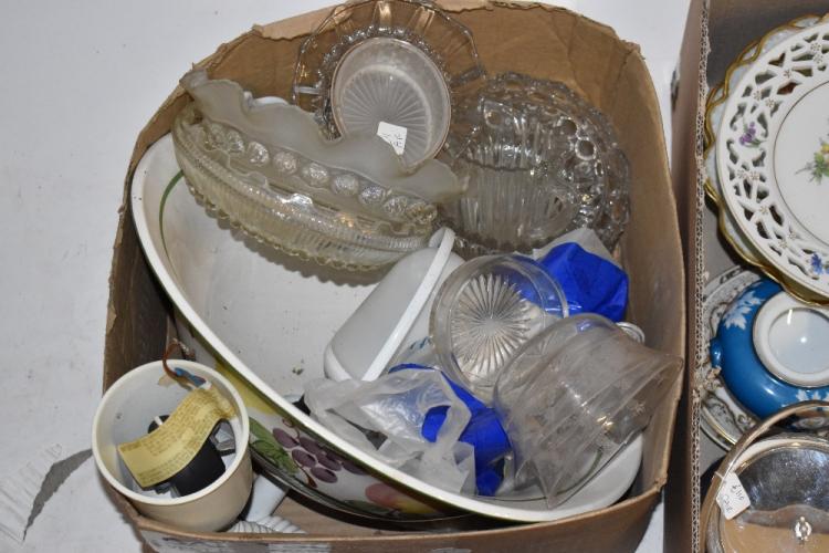 Lot 1665 of 2131: A large quantity of decorative ceramics including a jardinière, a biscuit barrel, plates, etc, also a small group of glassware, cruets, and vintage bottles, etc.
