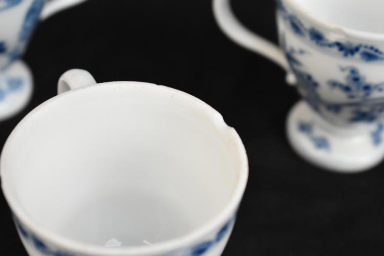 Lot 1677 of 2131: A harlequin set of ten 19th century Berlin porcelain custard cups and covers, decorated with a variation of the 'Onion' pattern, with loop handles and circular bases with blue underglazed sceptre mark to the underside, height 9.75cm (some faults).