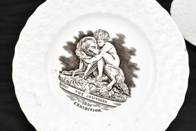 Lot 1691 of 2131: The Great Exhibition, Crystal Palace 1851, a group of five Pratt-type plates with moulded borders and central transfers, including 'Boy with Broken Drum', 'Gratitude', 'Massacre of the Innocence' and 2 x 'The Deliverer', diameter 19.5cm.