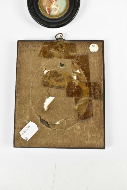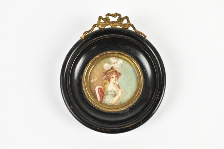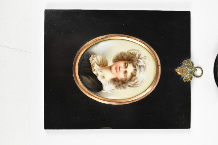 Lot 1717 of 2131: A late 19th century Continental porcelain oval plaque painted with the head and shoulders portrait of a young girl wearing a white ruff and bonnet, indistinct impressed mark to the reverse, 8 x 6.25cm, framed, also a decorative small circular portrait miniature signed Nived (2).