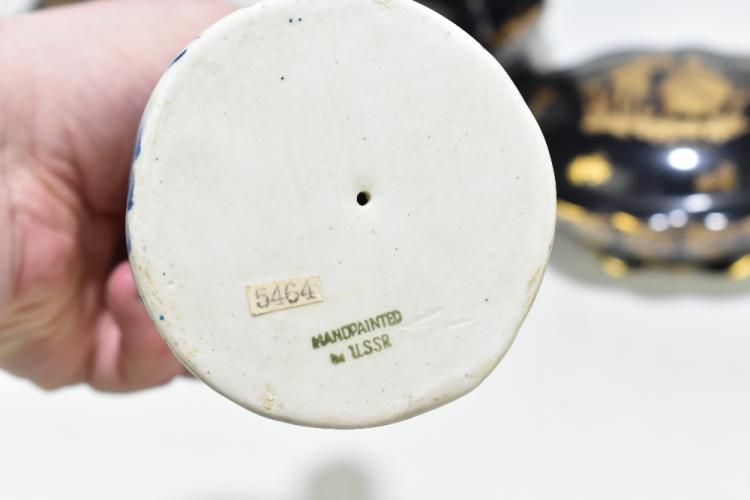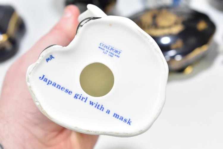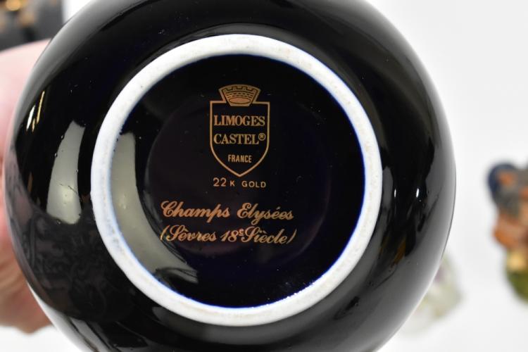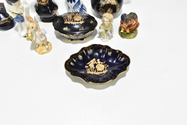 Lot 1718 of 2131: LIMOGES CASTEL; five pieces of dark blue gilt heightened porcelain, a modern Beswick Peter Rabbit gardening figure, a modern Coalport Japanese girl with a mask figure and three further figures.