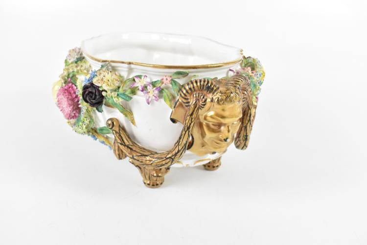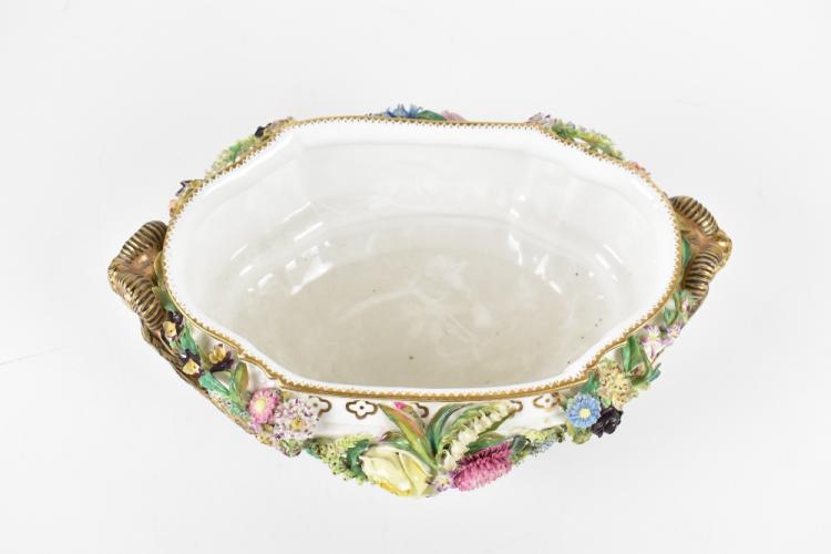 Lot 1725 of 2131: ATTRIBUTED TO JOHN BEBBINGTON; a 19th century floral encrusted oval bowl, profusely decorated with flowers and with two mask head mounts, on gilt acanthus leaf feet, height 14cm, length 36cm.
