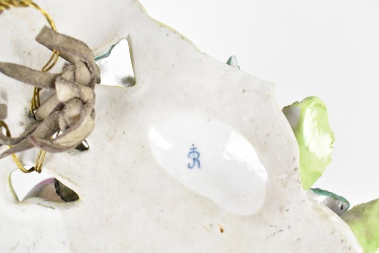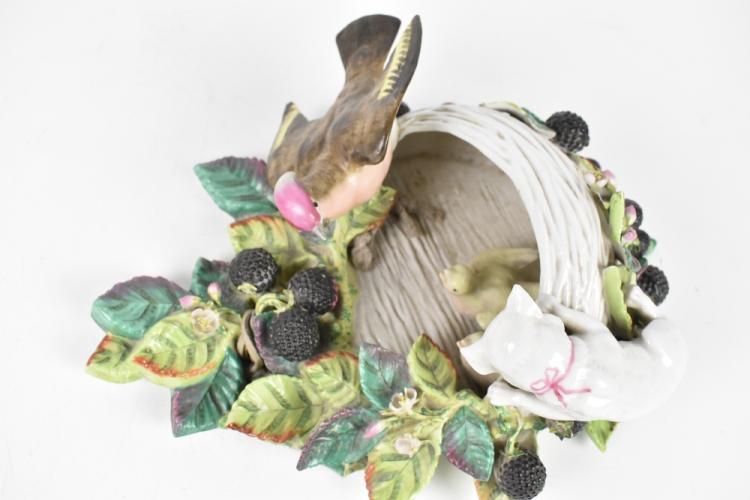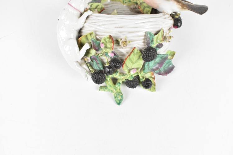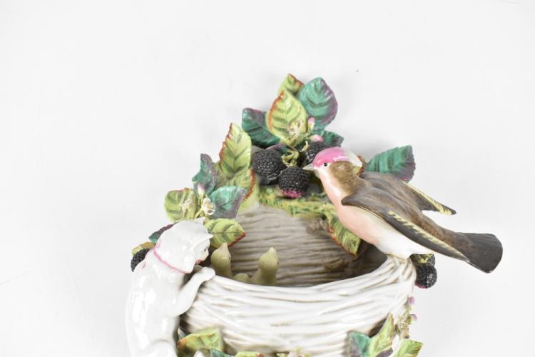 Lot 1727 of 2131: A late 19th century German wall pocket, modelled as a bird's nest with a bird, two chicks and cat and encrusted with fruiting vines, height 31cm.