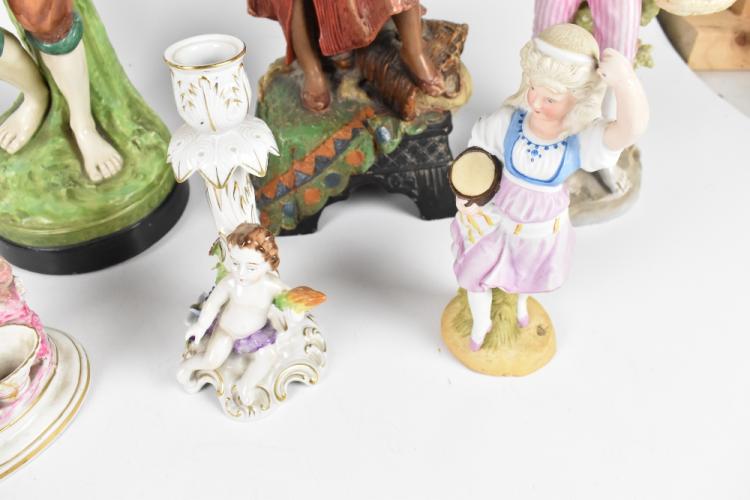 Lot 1728 of 2131: A collection of 19th century and later Continental ceramic and pottery figures, to include a Continental pottery figure of a female Arabian figure standing upon a carpet, height 44cm, a figure of a man drinking a goblet of beer, a pair of German porcelain figures holding baskets, a Sampson porcelain figure of a parrot and four others (9).