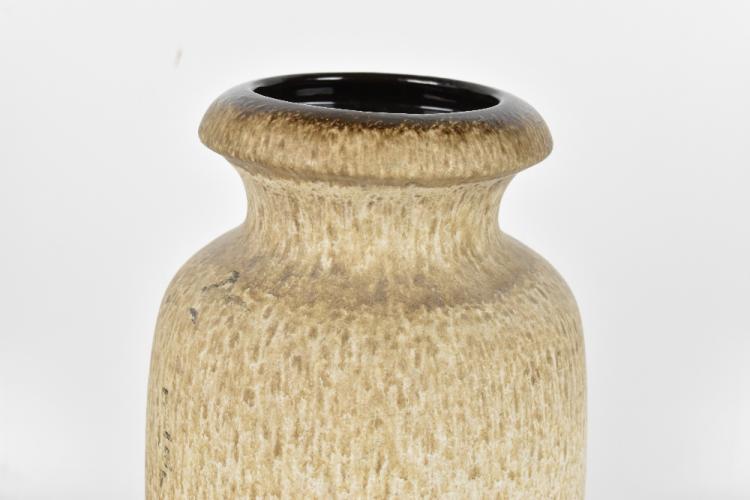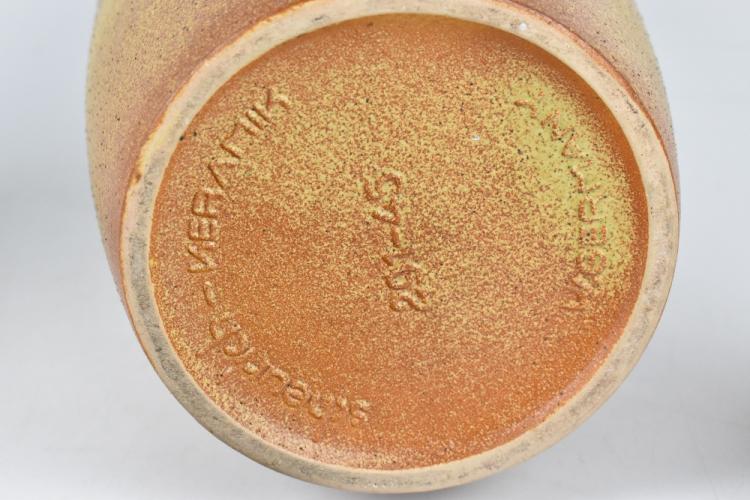 Lot 1731 of 2131: POOLE; a pottery vase decorated with abstract design against a red ground, height 16cm, with a pottery plate decorated with red dots and two German pottery vases decorated with stylised glazes, the taller height 45cm (4).