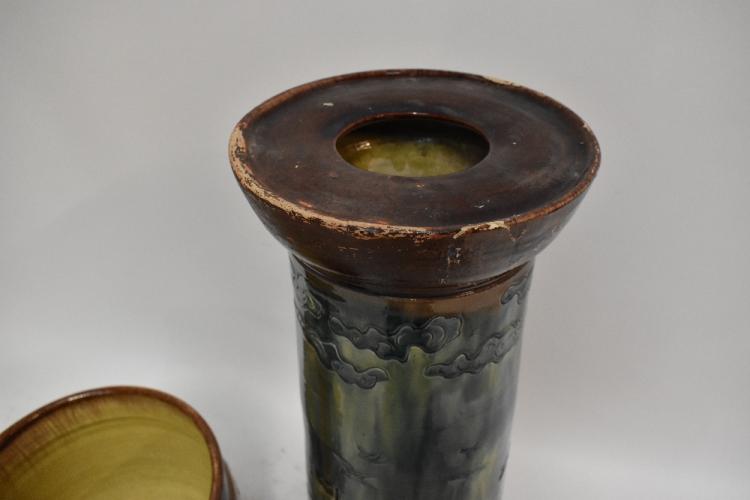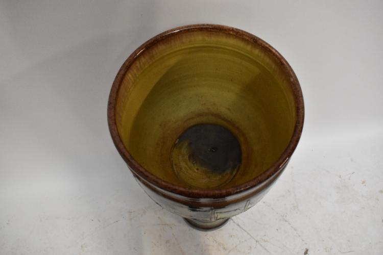 Lot 1738 of 2131: A Continental Arts and Crafts pottery jardinière on stand, possibly Belgian, each decorated with an encircling pattern of boats and birds, unmarked, overall height 104cm (2).