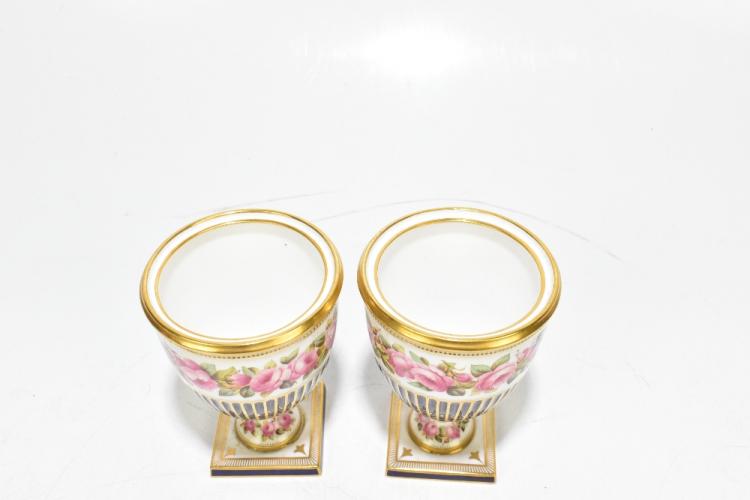 Lot 1742 of 2131: COPELANDS; a pair of porcelain rose painted urns and covers each with gilt heightening on a cobalt blue ground, painted marks to base and each lid with gilt printed mark 'Daniel Wigmore St. London', height 20cm.