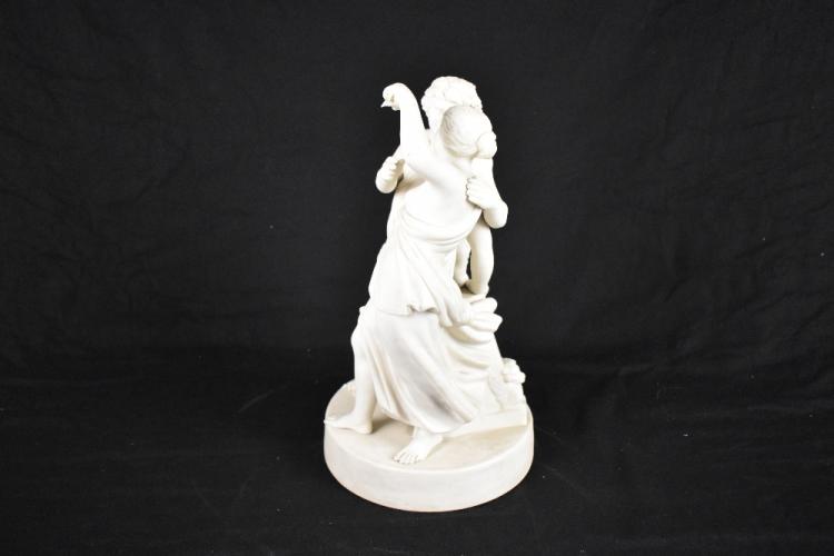 Lot 1775 of 2131: A late 19th century Parian figure group of a classical male and female with grapes and vines at their feet and griffin mounted column to the rear, height 33cm.
