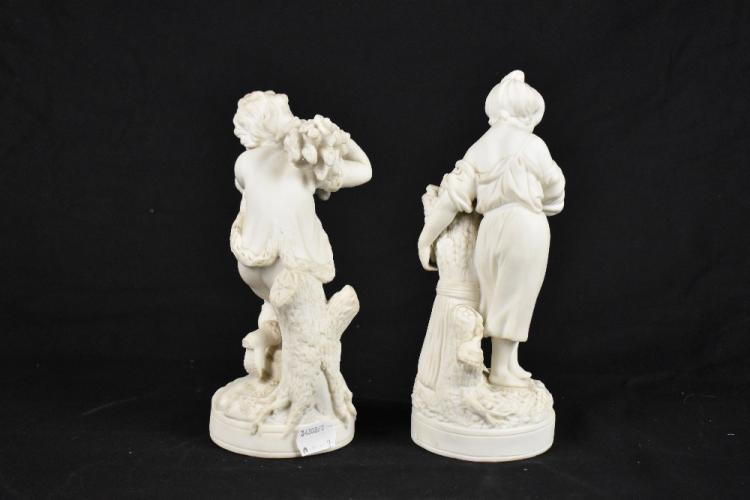 Lot 1776 of 2131: A pair of late 19th century Parian figures modelled as a young boy gathering faggots and a young girl gathering corn, height approx. 22cm, and a small Continental porcelain figure group of two figures seated on a bench, length 16cm (3).