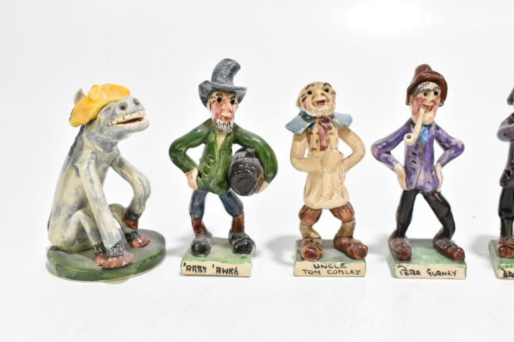 Lot 1779 of 2131: WIDECOMBE POTTERY; a group of eight figures each inscribed including ' Peter Gurney', 'Uncle Tom Cobley' and 'Peter Davey', also a Widecombe model of a seated donkey (9).