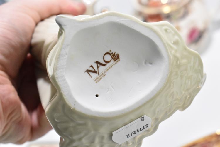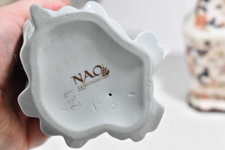 Lot 1781 of 2131: NAO; three figures, including a seated Dutch girl cradling a child, with five pieces of Mason's ironstone in the 'Mandalay' and 'Mandalay Red' pattern (8).