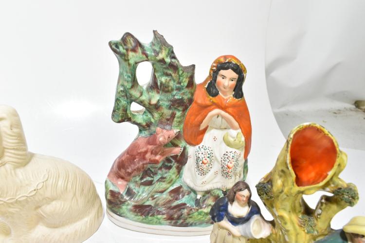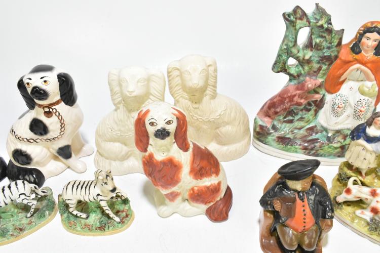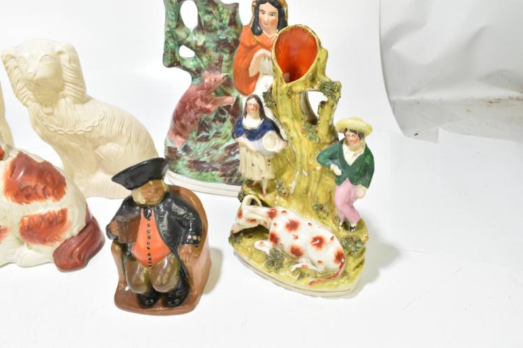 Lot 1785 of 2131: A pair of 19th century Staffordshire zebras, two Staffordshire spill vases (af), two pairs of spaniels and a Royal Doulton Lambeth stoneware figure of a portly seated gentleman.