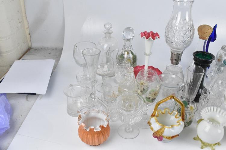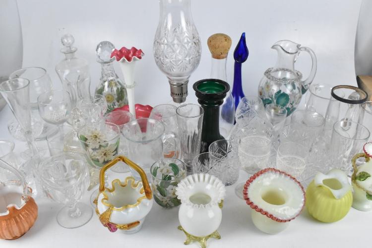 Lot 1792 of 2131: A quantity of glass including a cut glass storm lantern, Victorian opaque glass, cut glass drinking glasses, Vaseline tinted epergne, etc,