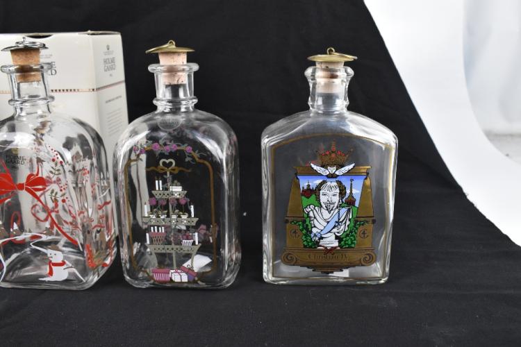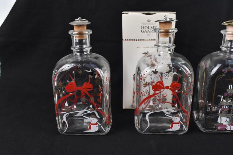Lot 1807 of 2131: HOLMEGAARD; three glass decanters and gilt metal stoppers, decorated with Christmas patterns, height 19cm, one in original box.