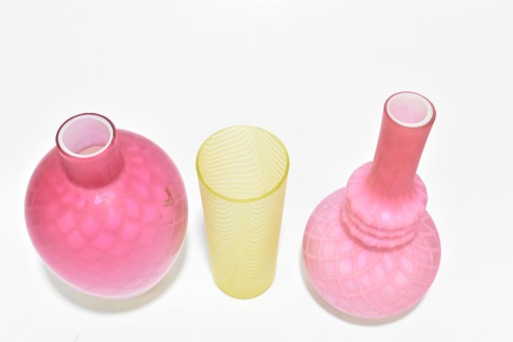 Lot 1813 of 2131: Two similarly decorated Webb pink tinted lattice decorated vases, height 20cm and 17cm and a Nailsea green/yellow feather decorated cyclindrical vase, height 14cm.