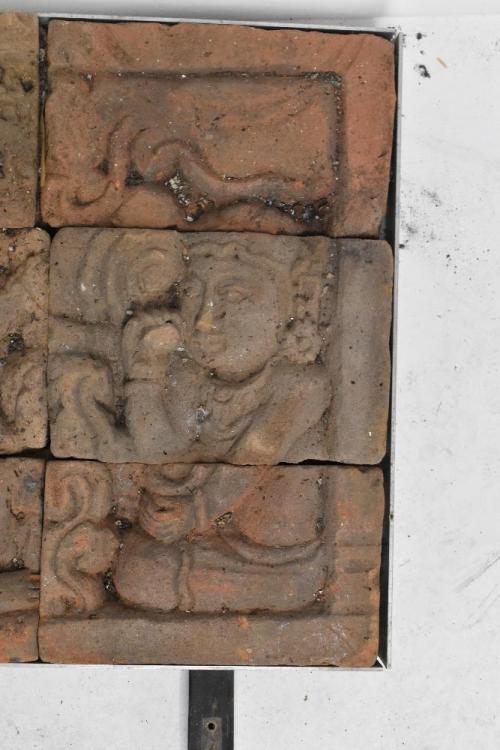 Lot 1820 of 2131: A 14th/15th century Javanese Majapahit Kingdom terracotta plaque, with six panels representing two figures in relief, in stainless steel and modern black frame, 57 x 63cm.