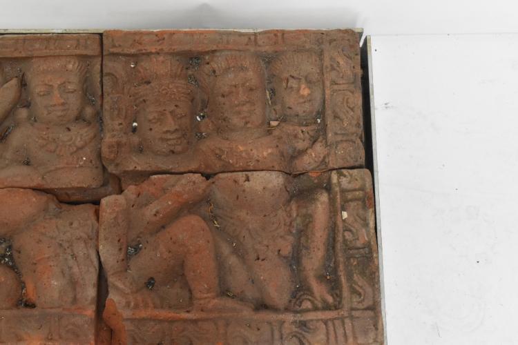 Lot 1823 of 2131: A 14th/15th century Javanese Majapahit Kingdom terracotta plaque, featuring nine figures in relief inside stylised border, in stainless steel and black painted modern frame, 40 x 91cm.