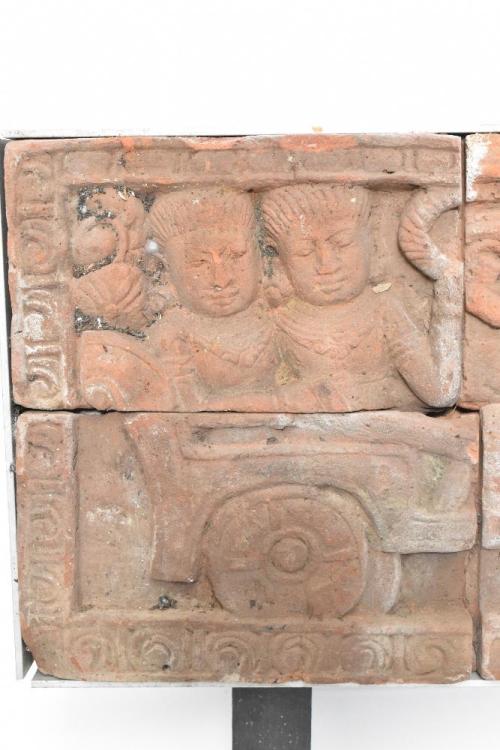 Lot 1829 of 2131: A 14th/15th century Javanese Majapahit Kingdom terracotta plaque, relief decorated with five figures, in modern and metal black painted frame, 36 x 89cm.