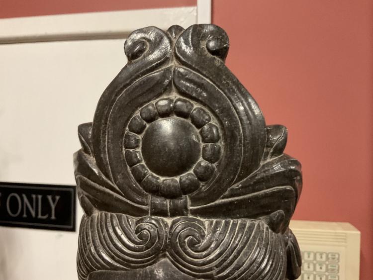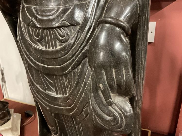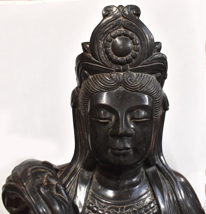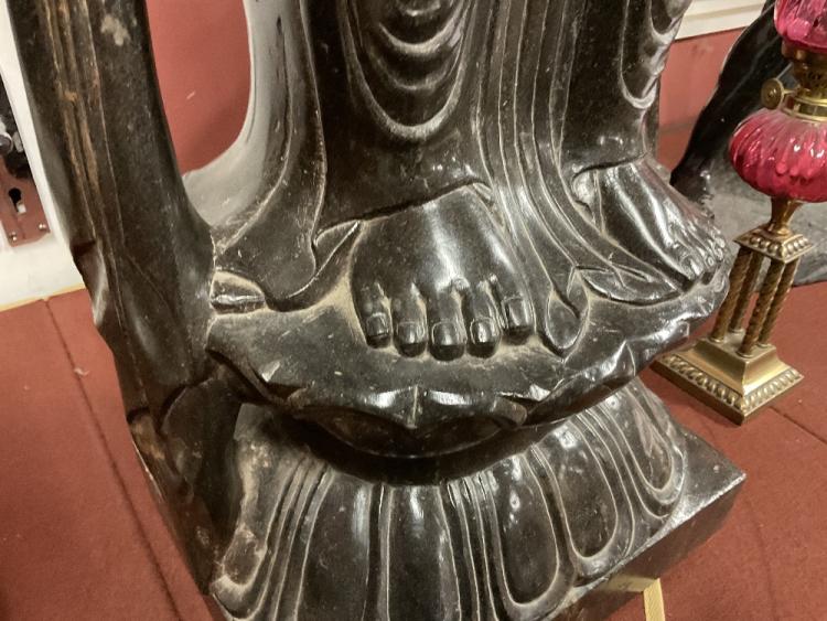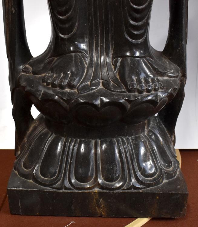 Lot 1842 of 2131: A large carved stone figure of Guanyin, set on an integral lotus leaf rectangular sectioned base, height 99cm.