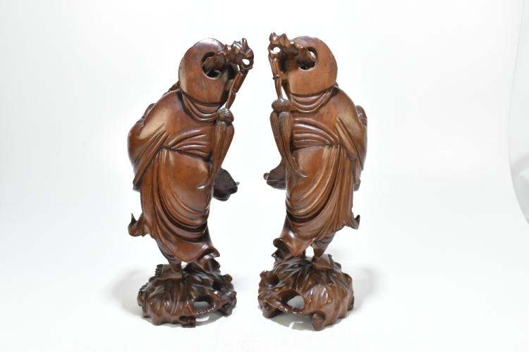Lot 1857 of 2131: A pair of late 19th century Chinese carved rootwood figures of immortals, raised on naturalistic plinth base, height 39cm (2).