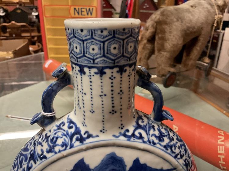 Lot 1868 of 2131: A late 19th century Chinese blue and white porcelain twin handled moon flask, decorated to the front and reverse with mountainous landscapes and painted lotus flowers to the side, bears four character Kangxi mark to the underside, height 30cm.