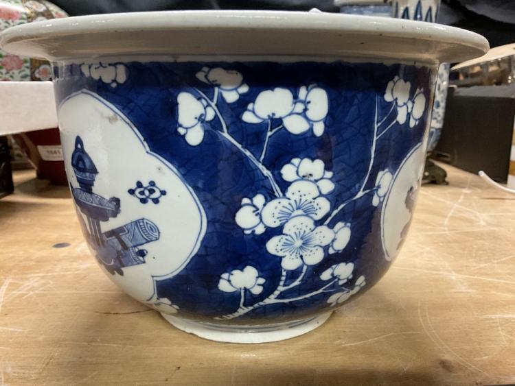 Lot 1872 of 2131: A 19th century blue and white vase decorated with objects, fish and scrolling detail converted to a table lamp with applied brass rims, height 28cm, with an early 20th century blue and white jardinere decorated with panels of objects inside prunus decoration, height 15cm, diameter 24cm (2).