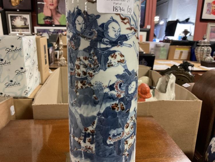 Lot 1874 of 2131: A late 19th century blue and white ginger jar with associated carved wooden cover, with three panels decorated with objects inside prunus floral decoration, height 26cm, together with a late 19th century Chinese blue and white clobbered sleeve vase, decorated with warriors, bears four character Kangxi mark to the underside, height 26cm (2).