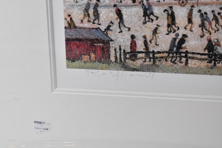 Lot 2074 of 2131: ROLF HARRIS (born 1930); a signed limited edition coloured print, 'Coming from the Mill (after L.S. Lowry)', no.287/695, with certificate of authenticity, 38 x 50.5cm, mounted but unframed. (D)