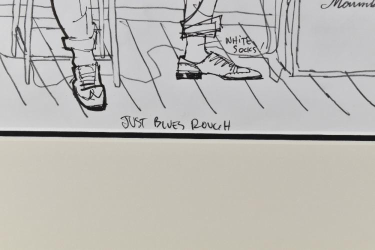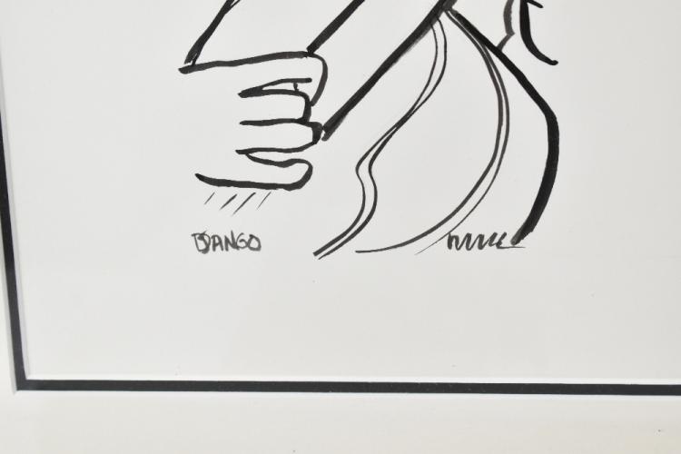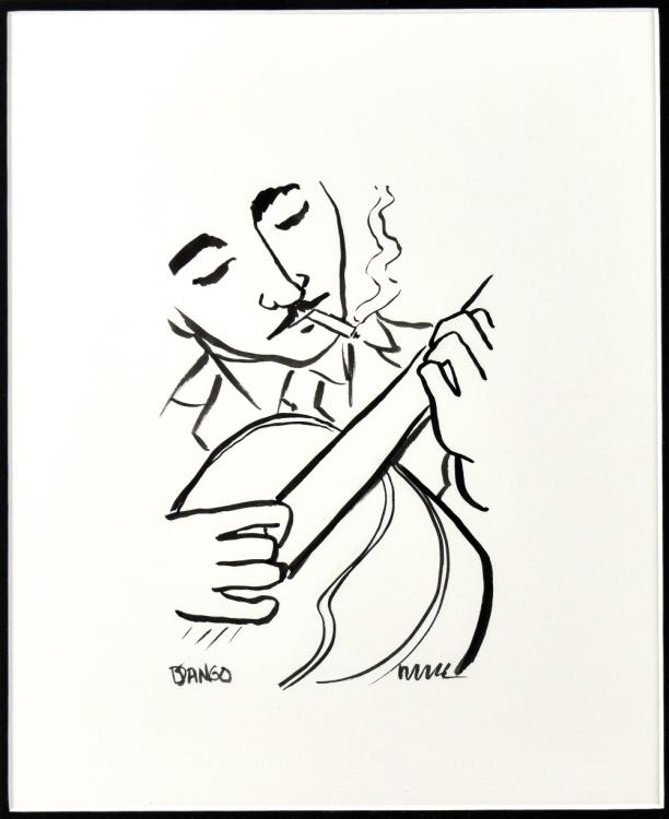 Lot 2104 of 2131: M. HAMNER; ink drawing, "Jazz Legend 1 - Django Reinhardt", 31 x 25cm, framed and glazed, with a further ink drawing by Todd White, 'Just Blues', 21.5 x 27cm, framed and glazed (2).