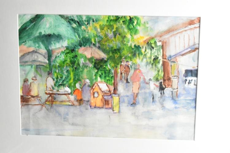 Lot 2148 of 2131: MARJORIE J ALTARAS; oil, 'Going for a Walk', signed lower right, 26.5 x 34cm, with three further works by the same artist, including a watercolour, acrylic on board and another watercolour 'Picnic in the Park', each framed and glazed (4). (D)