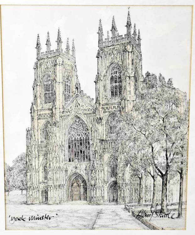 Lot 2152 of 2131: ALAN STUTTLE; coloured print, York Minster, 25 x 20cm, with a further pencil signed print of King's College Chapel and a further print signed W. A. Cox 'A Game of Cards', each framed and glazed (3). (D)