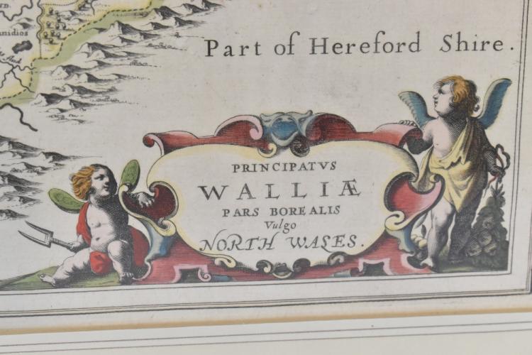 Lot 2164 of 2131: PRINCIPATUS WALLAE PARS BOREALIS VULGO NORTH WALES; a Robert Morden engraved map of North Wales, with hand coloured detailing, 41.5 x 53cm, framed and glazed on both sides.
