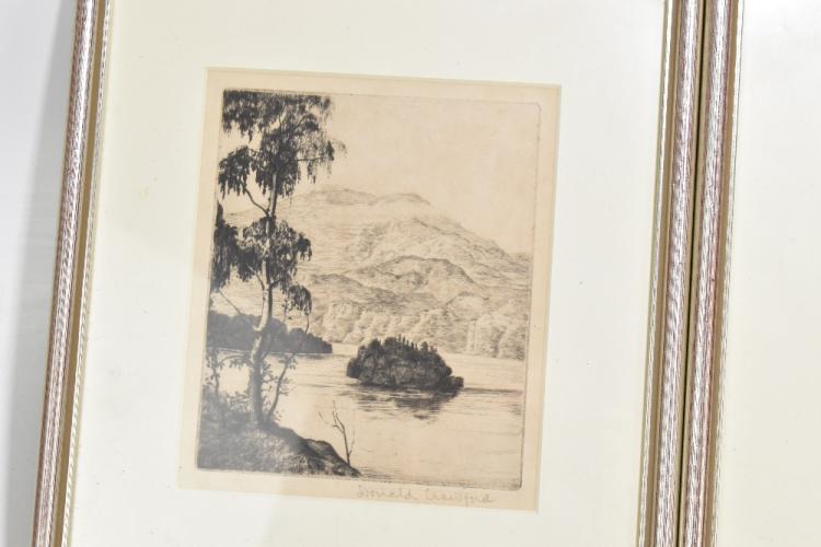 Lot 2170 of 2131: DONALD CRAWFORD; a pair of etchings, 'Loch Katrine' and another of a bridge across a river, each signed in pencil, 16.5 x 13.5cm, with a framed patchwork sampler and an oak mirror (4).
