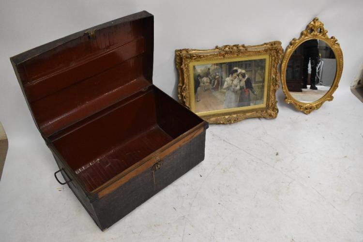 Lot 2172 of 2131: A 19th century print titled 'The Love Letter', in elaborate gilt wood and gesso frame, 56 x 72cm, with a git wood and gesso oval wall mirror, height 73cm, and a painted metal trunk (3).