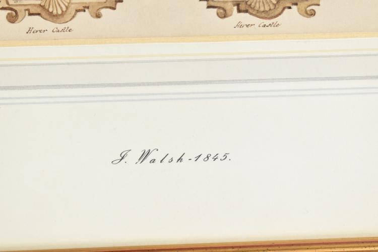 Lot 2199 of 2131: J. WALSH; watercolour depicting various castles and ruins, including Mayfield, Hever Castle, Dewhurst, unsigned, inscribed to mount, 15 x 23cm, with a print, 'The Horseguard London', 30 x 24cm, each framed and glazed (2).