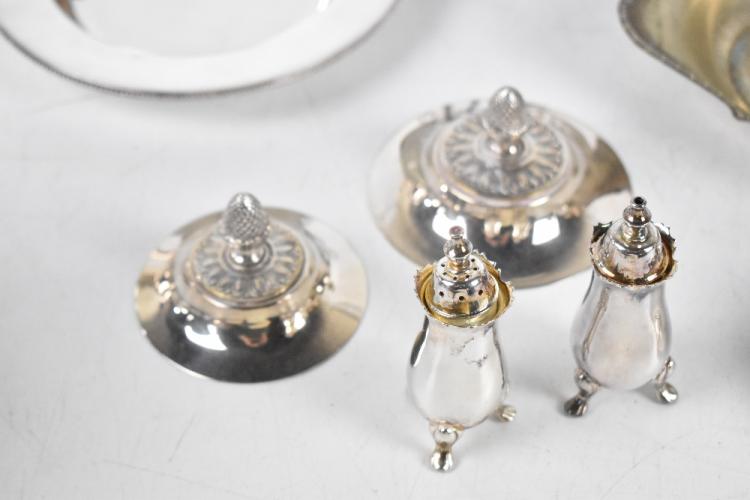 Lot 2240 of 2131: A grouping of silver plate including tureen and cover, swing handled pedestal basket, hot water pot, etc.