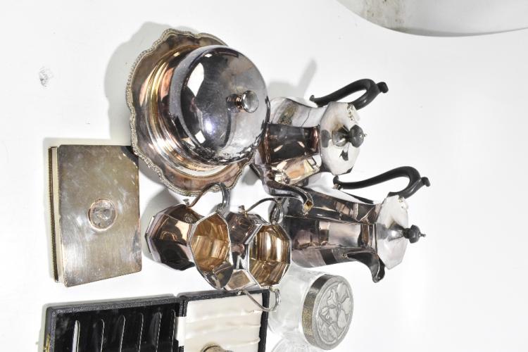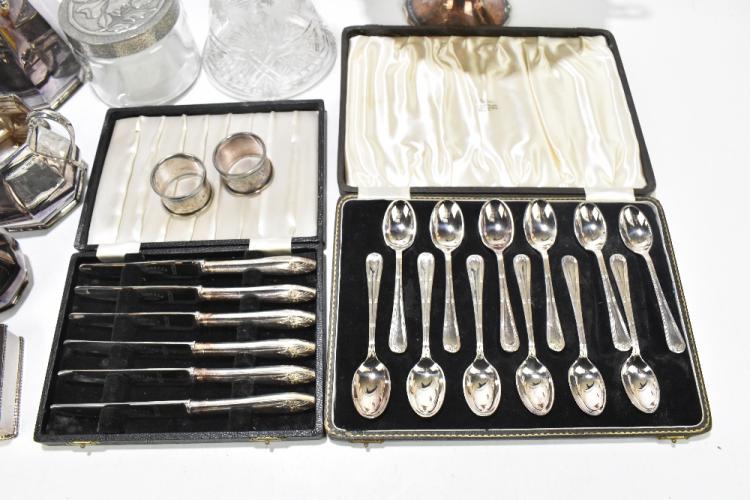 Lot 2254 of 2131: A small collection of assorted silver plate including a cut glass claret jug with silver plated mount, twin handled footed bowl, muffin dish, cased set of knives, etc.