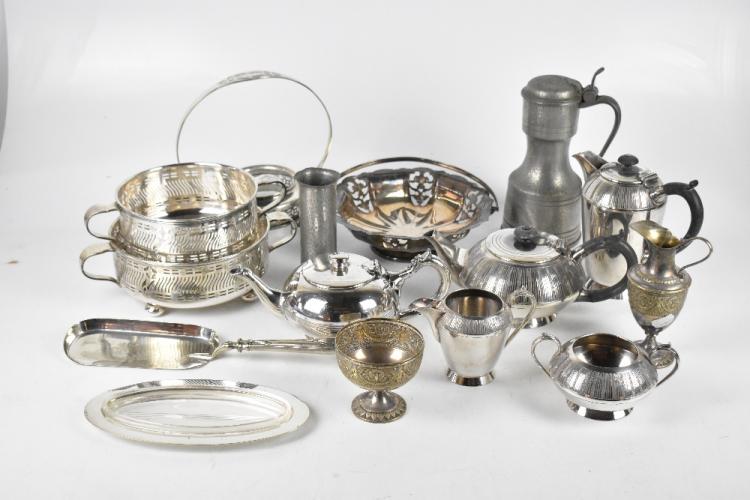 Lot 2260 of 2131: An assortment of silver plate including pedestal swing handle basket, Art Deco style salver, also a pewter tappit-hen tankard, etc.