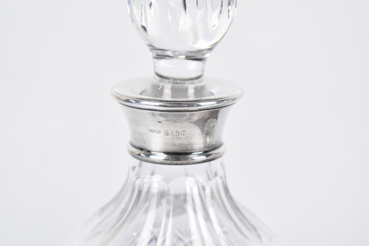 Lot 2317 of 2131: A pair of modern hallmarked silver mounted cut glass decanters and stoppers, on walnut stand with engraved presentation plaque 'The active business services business handicapped stakes, Pontefract 1993', Birmingham 1993, height of decanter 18cm.