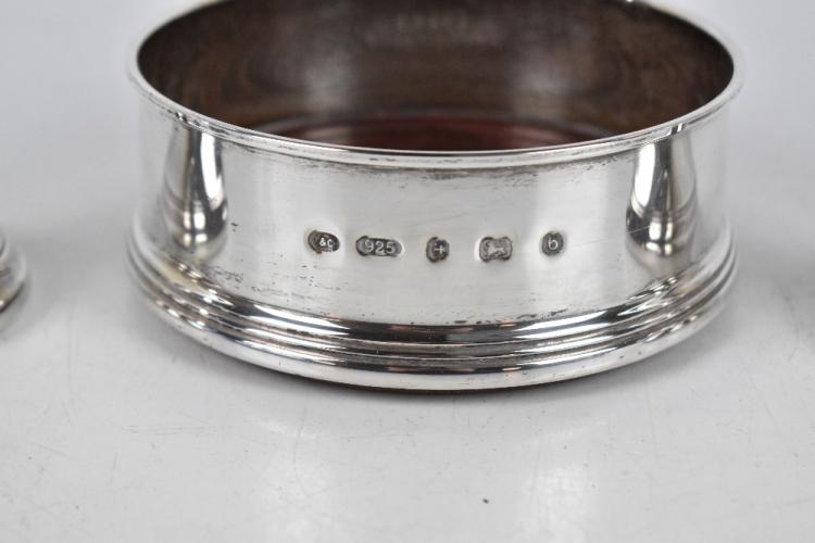 Lot 2318 of 2131: A modern silver mounted bottle coaster, Birmingham 2001, diameter 13cm, together with a pair of hallmarked silver candlesticks, Birmingham 2001, height 14cm (3).