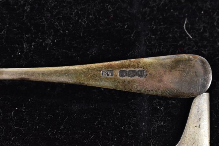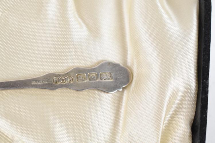 Lot 2328 of 2131: HENRY CLIFFORD DAVIES; a cased set of six Elizabeth II hallmarked silver teaspoons with cast scrolling handles, Chester 1958, with a further cased set of hallmarked silver coffee bean spoons and a cased two piece hallmarked silver child's food push and spoon, approx. 4.6ozt/144g.