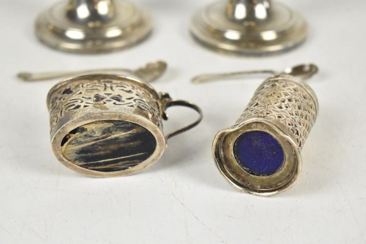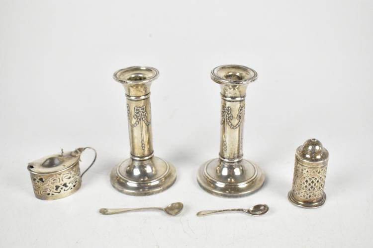 Lot 2332 of 2131: A pair of George V loaded hallmarked silver candlesticks with integral sconces and ribbon tied swag detail, Birmingham 1915, height 12.5cm, also a lidded mustard, cylindrical salt and two associated spoons.