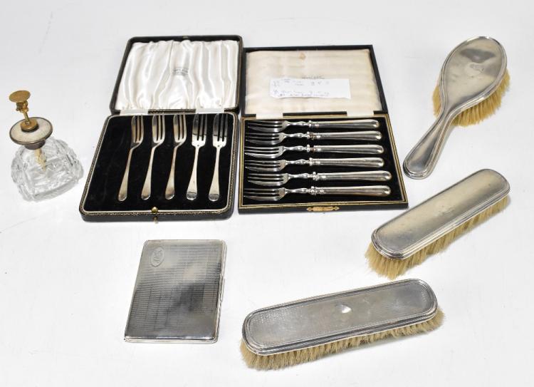 Lot 2336 of 2131: RN; a George VI hallmarked silver cigarette case with engine turned decoration, Birmingham 1946, together with a cased set of five silver cake forks, silver handled forks, three dressing table brushes and atomiser, weighable 9.2ozt/286g.