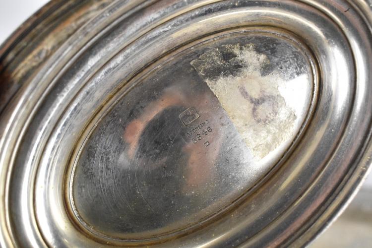 Lot 2362 of 2131: THE FRANK HERSCHEDE COMPANY; a sterling silver oval dish with engraved initials, together with a sterling silver oval bread basket with cast handle and a sterling silver bowl with pierced edge, combined approx. 28.36ozt/882g.